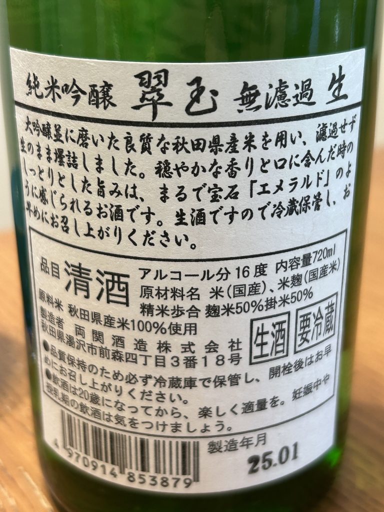 その名も、「翆玉 純米吟醸 無濾過 生」。秋田県の両関酒造さんが手がける一本です。