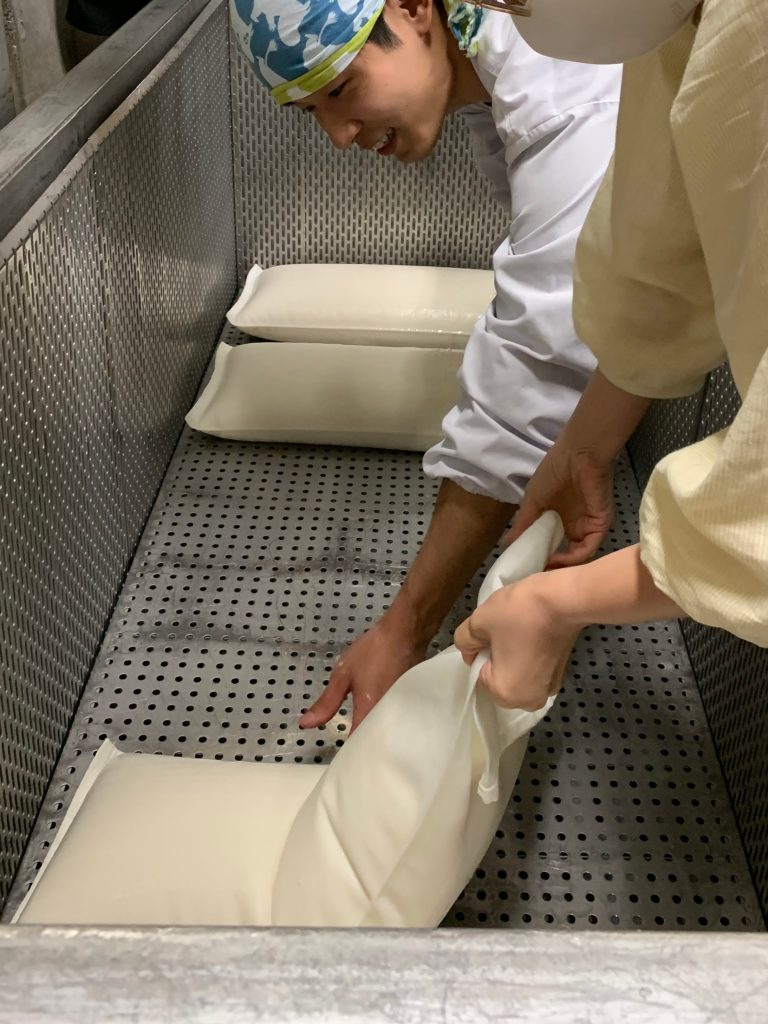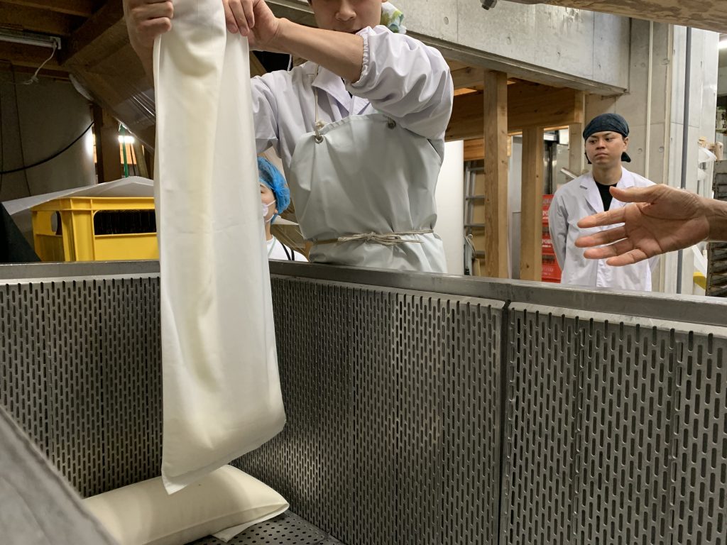 もろみが入った袋は布を折るだけでこぼれないようにするんです。ちょっとしたコツが必要でジッパーなどもないのに中の液体で漏れたりしないのが本当に不思議です。