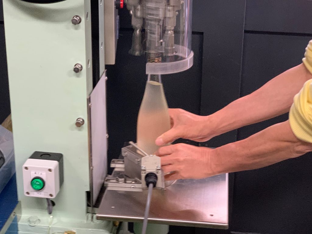 次は日本酒のボトリング。絞った日本酒 鏡山を正確に計って瓶に充填します。そしてキャップを瓶にかぶせて締め付けをする機械でしっかりと封緘をしました!