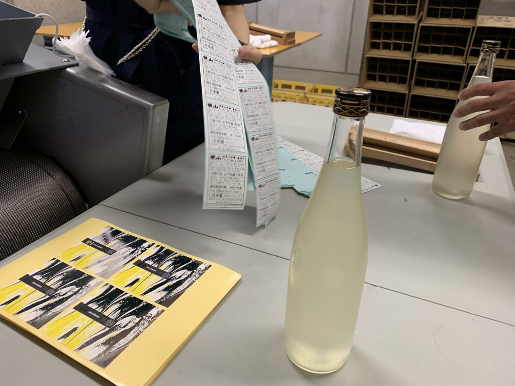 そして、今回の「鏡山 純米大吟醸 愛山」を完成させるラベル張りです。鏡山さんの日本酒ではあまり観ることがない特別な黄色い銘柄ラベルです。