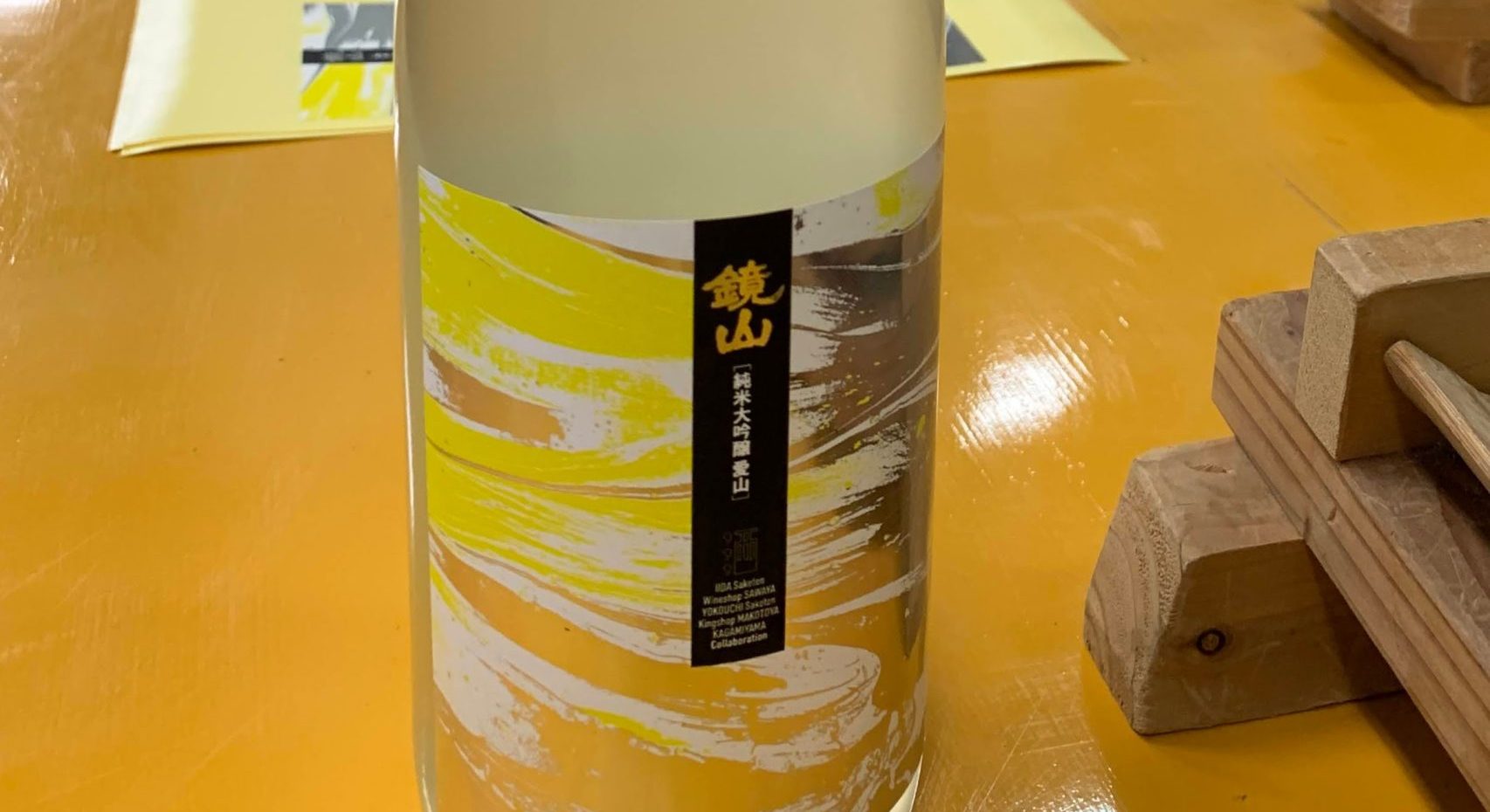 そして、今回の「鏡山 純米大吟醸 愛山」を完成させるラベル張りです。鏡山さんの日本酒ではあまり観ることがない特別な黄色い銘柄ラベルです。