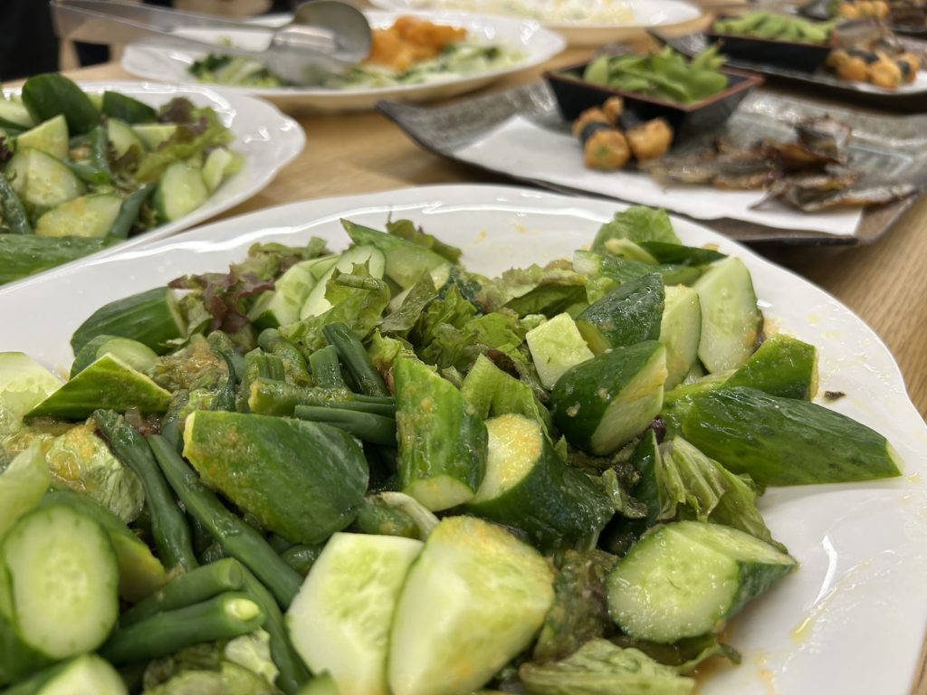さらに、農大の圃場で栽培された新鮮な野菜料理もたくさんあって、彩り豊かで目でも楽しめるお料理ばかりでした。新鮮な野菜は、シャキシャキとした食感が心地よくて、日本酒との相性も抜群!ヘルシーなので、ついつい食べ過ぎちゃいました(笑)。