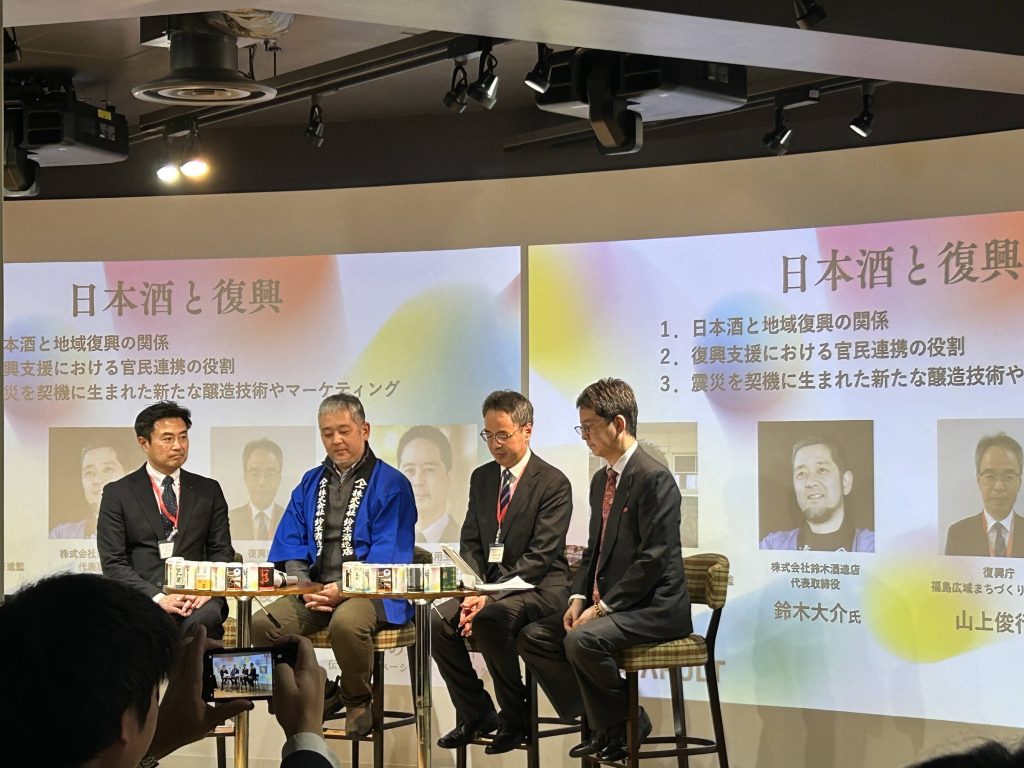 The first session was “Sake and Reconstruction.” The discussion focused on the role of sake in the reconstruction efforts following the Great East Japan Earthquake, with the brewery owner of Suzuki Shuzo in Namie, Fukushima Prefecture, and a representative from the Reconstruction Agency taking the stage.